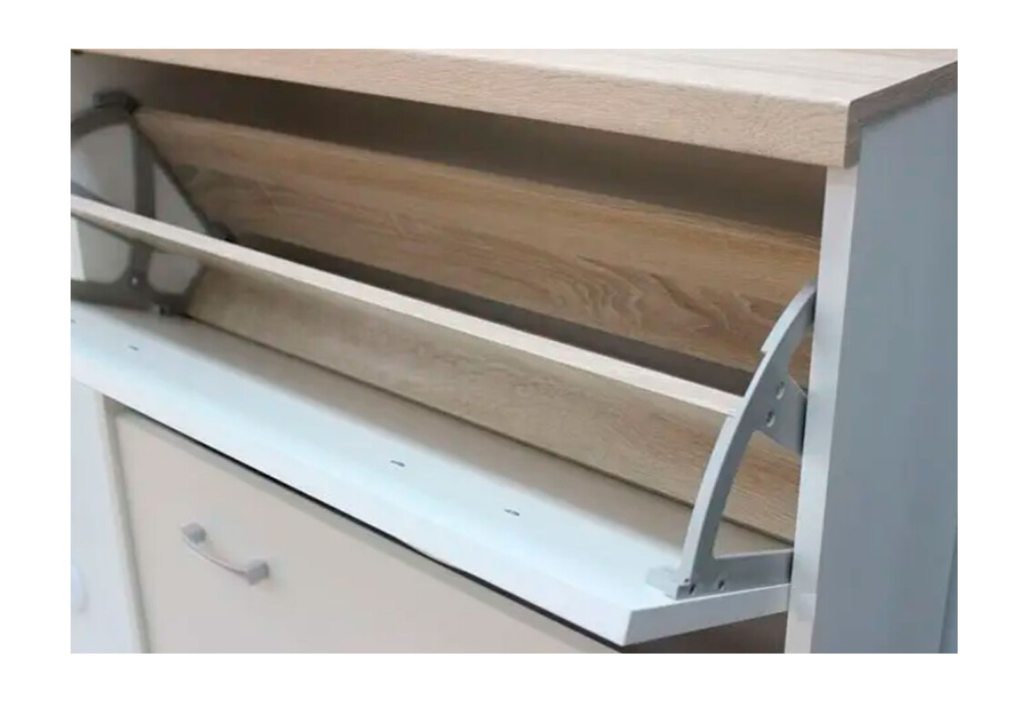 Тумба для взуття VMV holding Топ-мікс з 2 відділеннями – це ідеальне рішення для організації простору вашого передпокою. Виготовлена з якісної ламінованої ДСП, вона поєднує в собі функціональність та сучасний стиль. Білий колір в поєднанні з дубом сонома надає їй елегантного вигляду, що гармонійно впишеться в будь-який інтер'єр. Завдяки своїм компактним розмірам (ширина 80 см, висота 85 см, глибина 27 см) тумба займає мінімум місця, але при цьому пропонує достатньо простору для зберігання взуття. Два відділення дозволяють зручно організувати вашу взуттєву колекцію, а пластикові ручки забезпечують легкість у використанні. Цей товар стане надійним помічником у вашій оселі, адже він виготовлений з якісних матеріалів, що гарантують довговічність та стійкість до зношування.