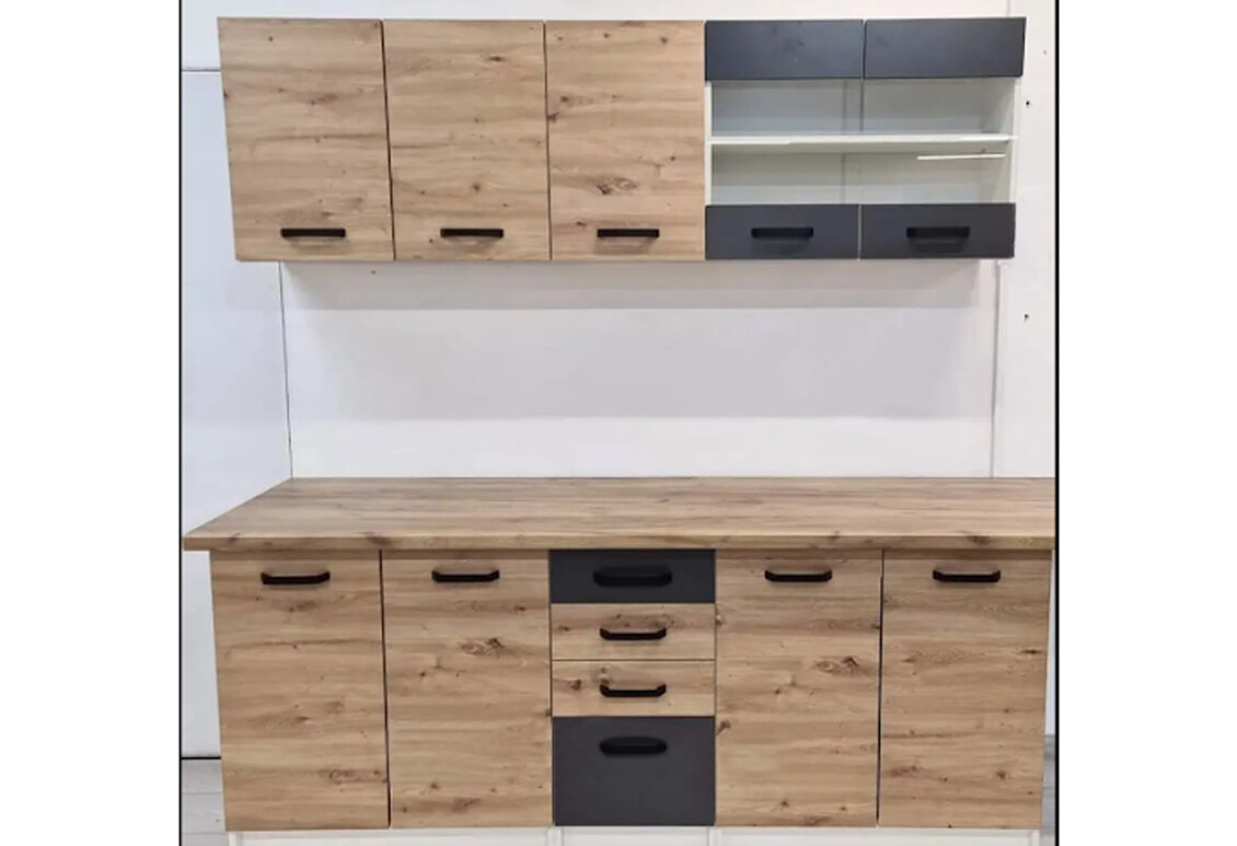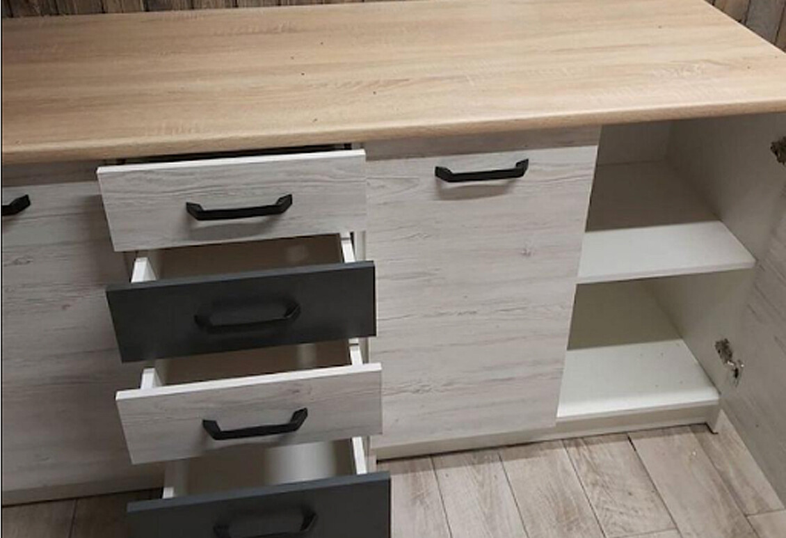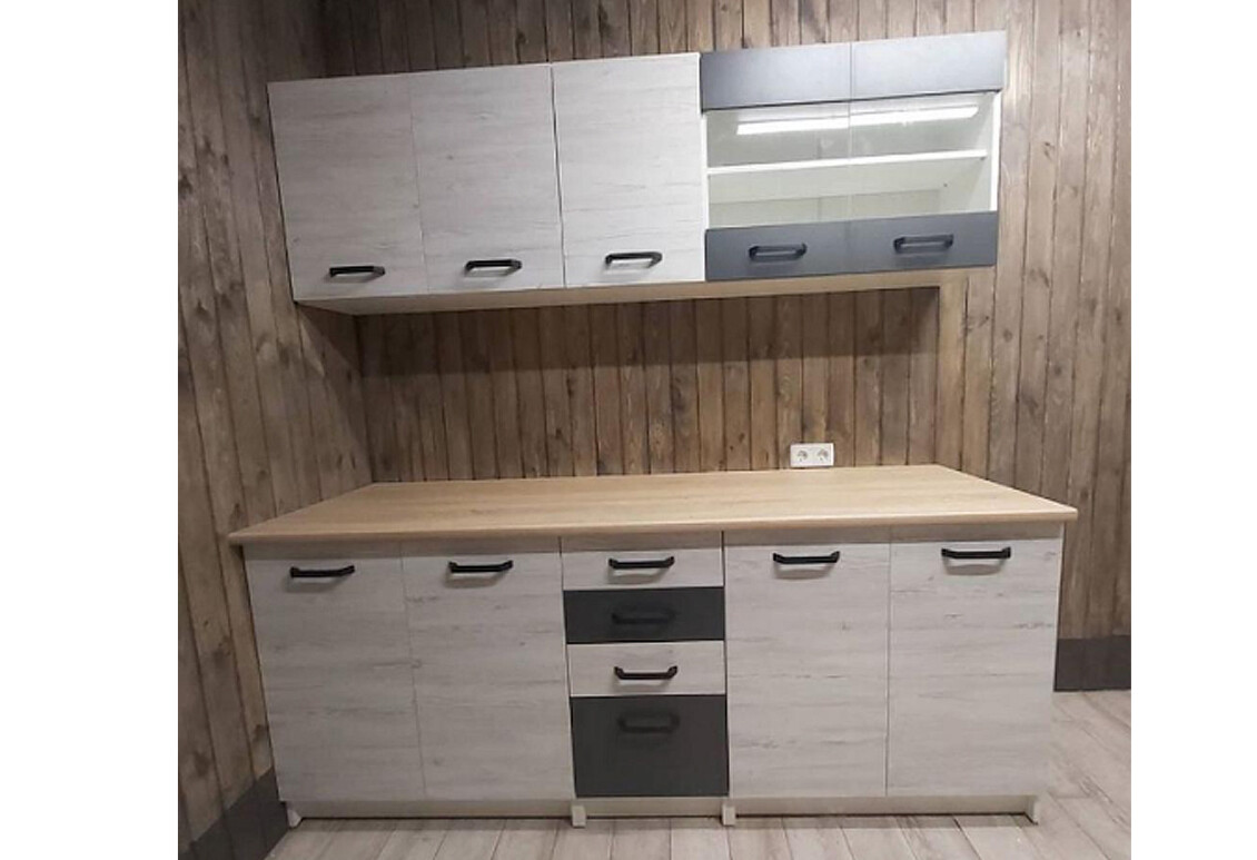 Кухня виготовлена з якісної плити ДСП, що забезпечує її надійність та довговічність. Фасад також виконаний з ДСП, що робить його легким у догляді та стійким до механічних пошкоджень. Кухня доступна в різних кольорових модифікаціях, що дозволяє підібрати варіант, який найкраще впишеться у ваш інтер'єр. Ви можете обрати фасад у кольорах: Аляска, Аляска з антрацитом, Дуб артизан з антрацитом, або Артвуд світлий з Артвудом світлим та антрацитом. Корпус завжди виконаний у класичному білому кольорі, що додає гарнітуру елегантності.