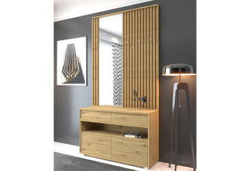 Передпокій Гербор Делі — це ідеальне рішення для вашого дому, що поєднує в собі елегантність, функціональність та доступну ціну. Завдяки своїм компактним розмірам (ширина 120 см, висота 170 см, глибина 36 см), він чудово впишеться навіть у найменші приміщення, забезпечуючи при цьому достатньо місця для зберігання. Матеріал виготовлення — ламінована ДСП, що гарантує надійність та довговічність, а класичний стиль передпокою додає йому вишуканості. У вас є можливість обрати між двома кольоровими модифікаціями: дуб артизан та ясен сніжний, що дозволить легко підібрати його під інтер’єр вашого дому.