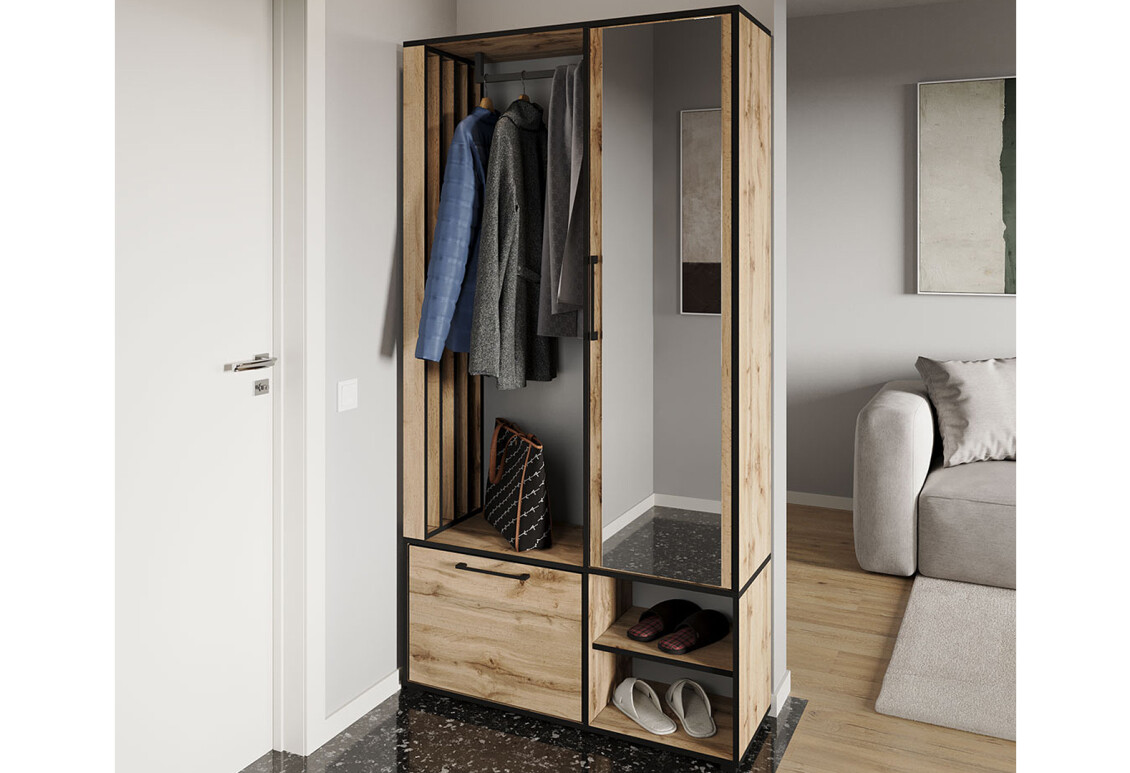 - Розмір: ширина 100 см, висота 190 см, глибина 33 см – оптимальні габарити для зручного використання в передпокої.