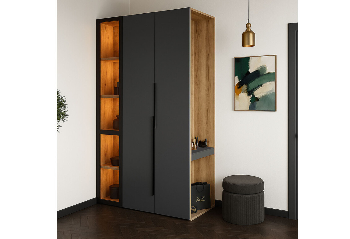 Передпокій складається з шафи з розкривними дверима, яка забезпечує зручний доступ до речей, а також вітрини з підсвіткою, що додає елегантності та функціональності. Внутрішнє наповнення шафи включає штангу для одягу та полиці, що дозволяє організувати простір максимально ефективно. Доступні модифікації товару дозволяють обрати між різними кольорами: дуб аппалачі / кашемір, дуб аппалачі / сіра мишка, дуб аппалачі / графіт та дуб аппалачі / німфея альба, що дає можливість підібрати ідеальний варіант для вашого інтер’єру.