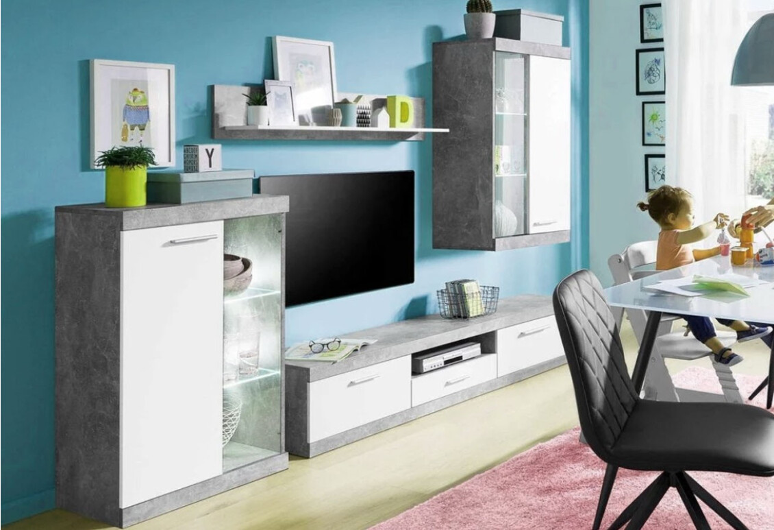 Комплект стінка з вітриною ВМК Кетлін - це ідеальне рішення для тих, хто цінує сучасний дизайн та функціональність. Виготовлена з якісної ламінованої ДСП, ця стінка поєднує в собі стиль та надійність. Її розміри (ширина - 255 см, висота - 190 см, глибина - 40 см) дозволяють ефективно використовувати простір, роблячи її чудовим вибором для вітальні або кабінету. Стиль модерн втілює елегантність, а поєднання білого кольору з бетонними елементами додає сучасного вигляду. Роликові напрямні забезпечують легкість у використанні, що робить цю стінку практичною та зручною у повсякденному житті.