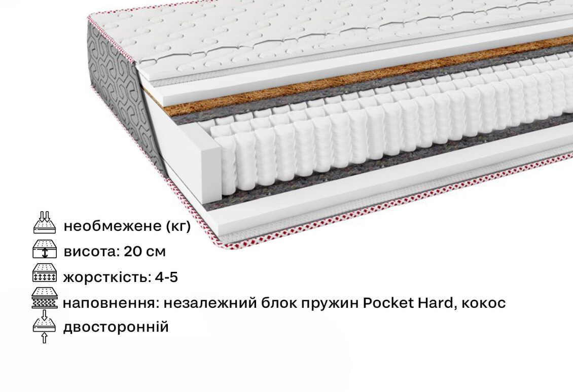 - Пружини Pocket Hard: 300 шт на 1м² – сприяють рівномірному розподілу ваги та зменшують тиск на тіло.