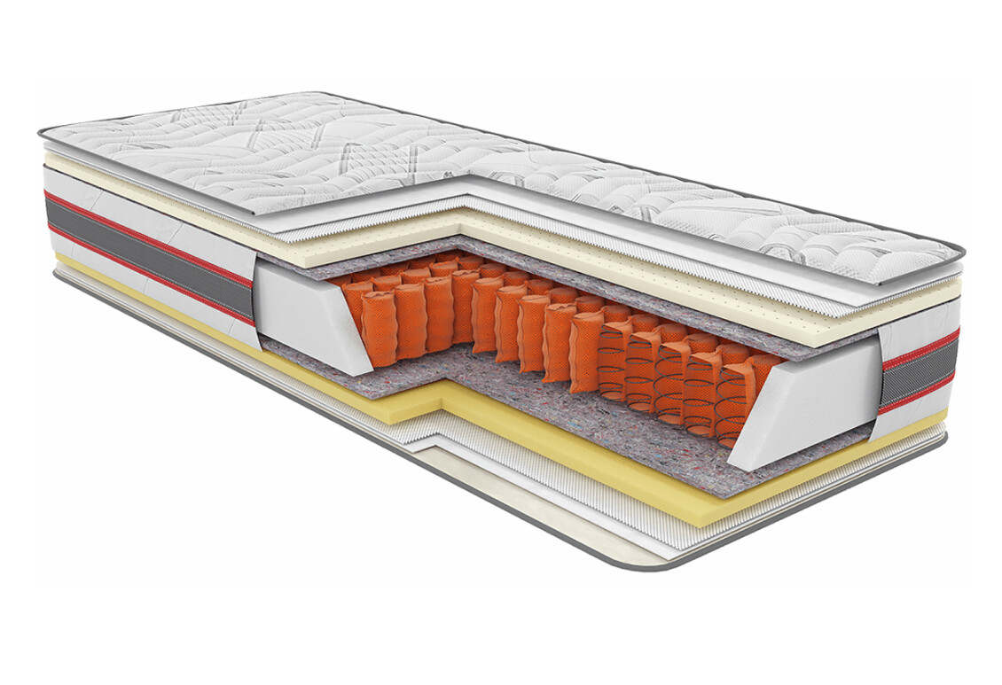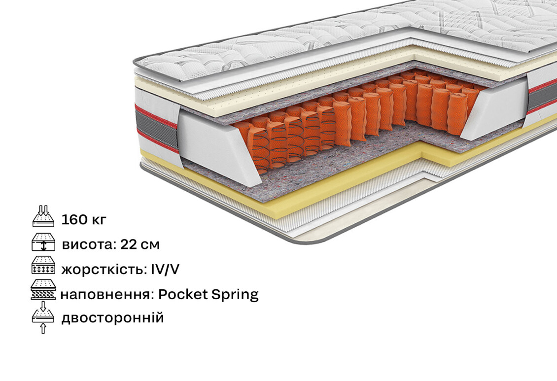 - Наповнення матраца: натуральний латекс, пружини pocket spring, внутрішня вентиляція, термоповсть, спанбонд, синтепон, visco memory