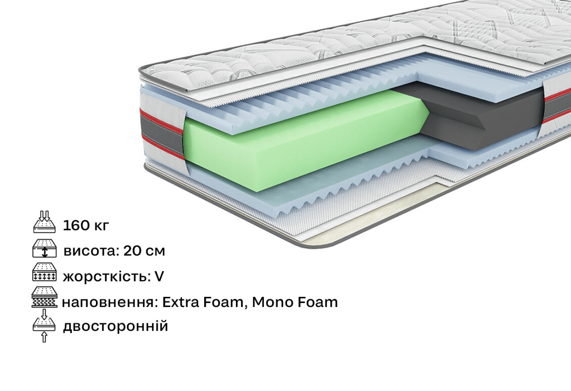- Наповнення матраца: spring foam 2, кокос, термоповсть, спанбонд, синтепон — забезпечує комфорт і підтримку;