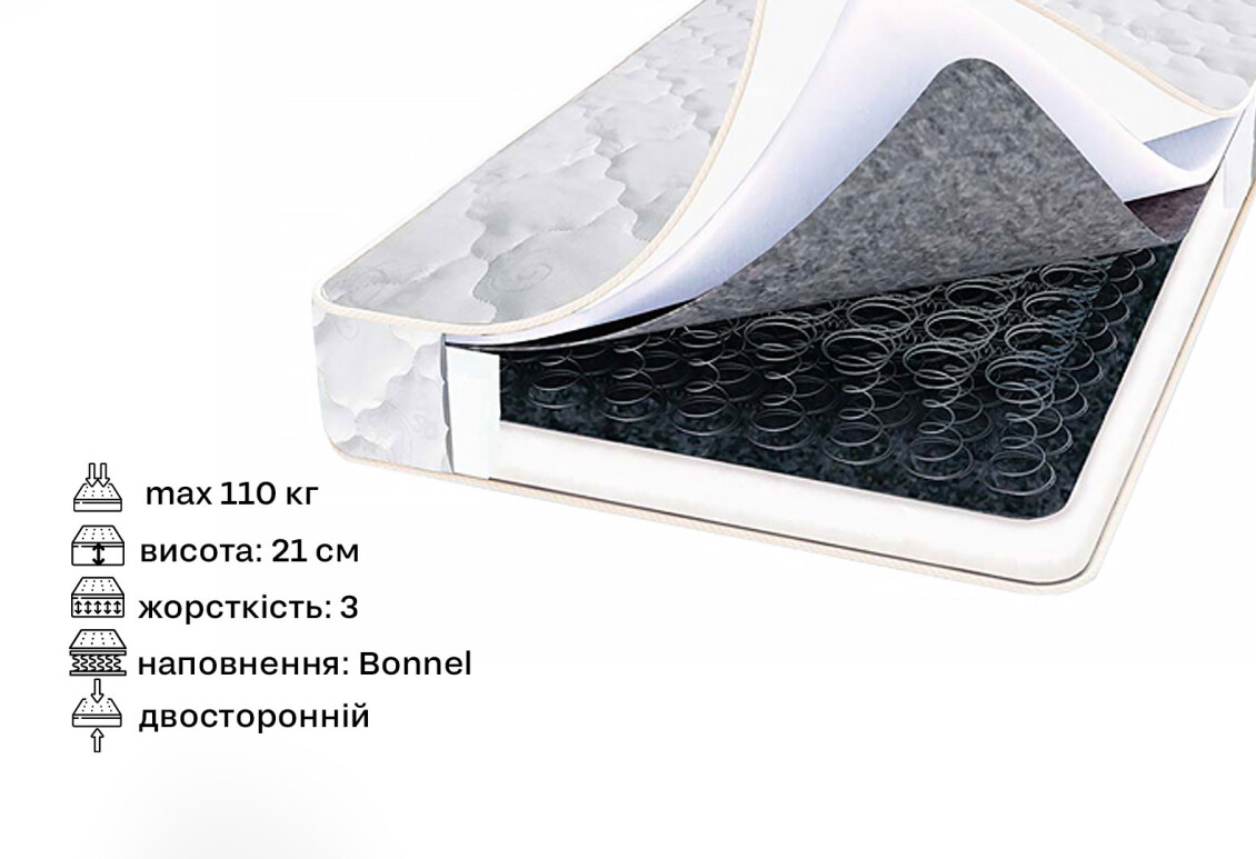- Наповнення матраца: ппу, пружини Bonnel, бавовна, вовна, термоповсть, спанбонд, синтепон – забезпечують максимальний комфорт та довговічність.