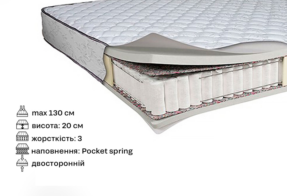- Наповнення матраца: ппу, пружини pocket spring, термоповсть, синтепон – забезпечують комфорт і підтримку під час сну.