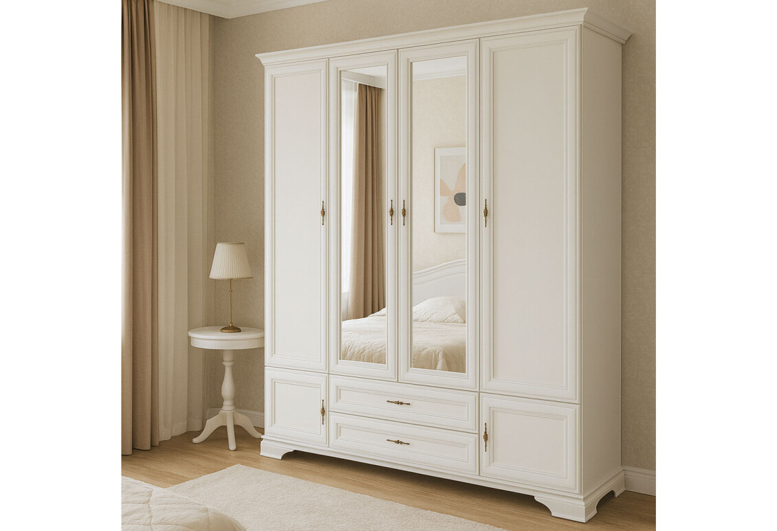 Шафа ВМК Кентукі 6-дверна з 2 шухлядами та дзеркалом — це ідеальний вибір для тих, хто цінує простір, функціональність та елегантність. Її розміри 228 см у ширину, 225 см у висоту та 61 см у глибину забезпечують достатньо місця для зберігання одягу та аксесуарів. Шафа виготовлена з якісних матеріалів: фасад з ламінованої ДСП, патинованого МДФ та скла, а корпус — з ламінованої ДСП. Білий колір надає їй класичного вигляду, що гармонійно впишеться в будь-який інтер'єр. Металеві ручки доповнюють стиль шафи, роблячи її не лише красивою, а й зручною у використанні.