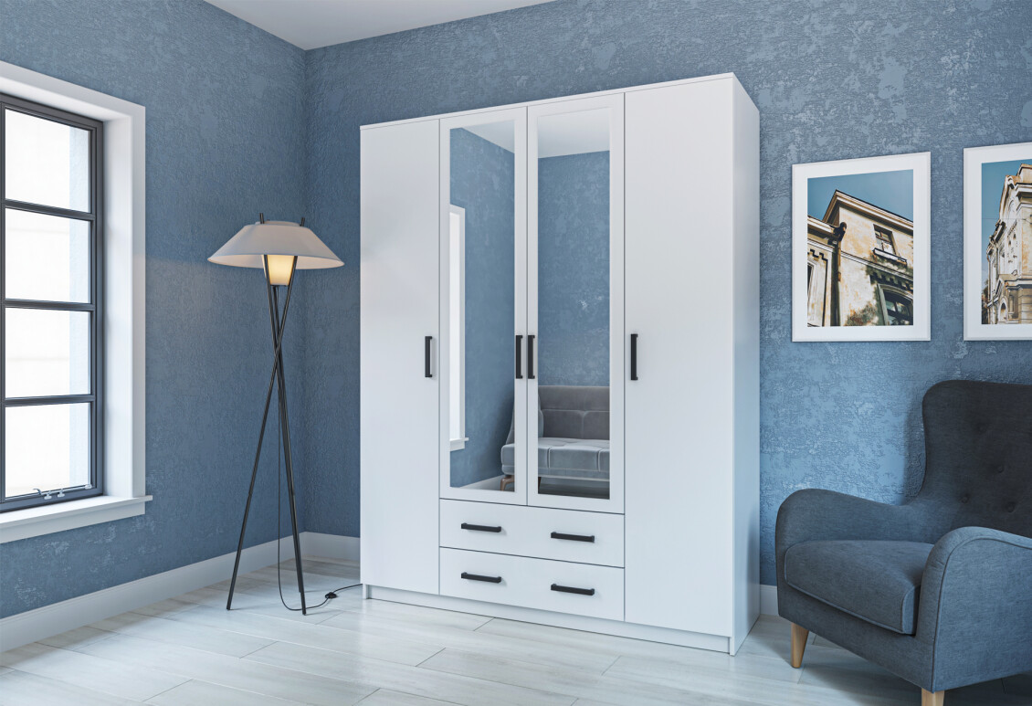 Шафа Garant Simple / Сімпл 4-дверна з 2 шухлядами та дзеркалом — це ідеальне рішення для тих, хто цінує якість та функціональність. Завдяки своїм розмірам (ширина 160.20 см, висота 205.00 см, глибина 52.00 см) вона надає достатньо місця для зберігання одягу та аксесуарів, не займаючи при цьому багато простору в кімнаті. Шафа виготовлена з ламінованої ДСП, що забезпечує її надійність та довговічність. Модерний стиль та елегантний колір німфея альба роблять цю шафу стильним доповненням до будь-якого інтер'єру. Телескопічні напрямні повного висуву забезпечують зручний доступ до вмісту шухляд, що робить користування шафою ще більш комфортним.