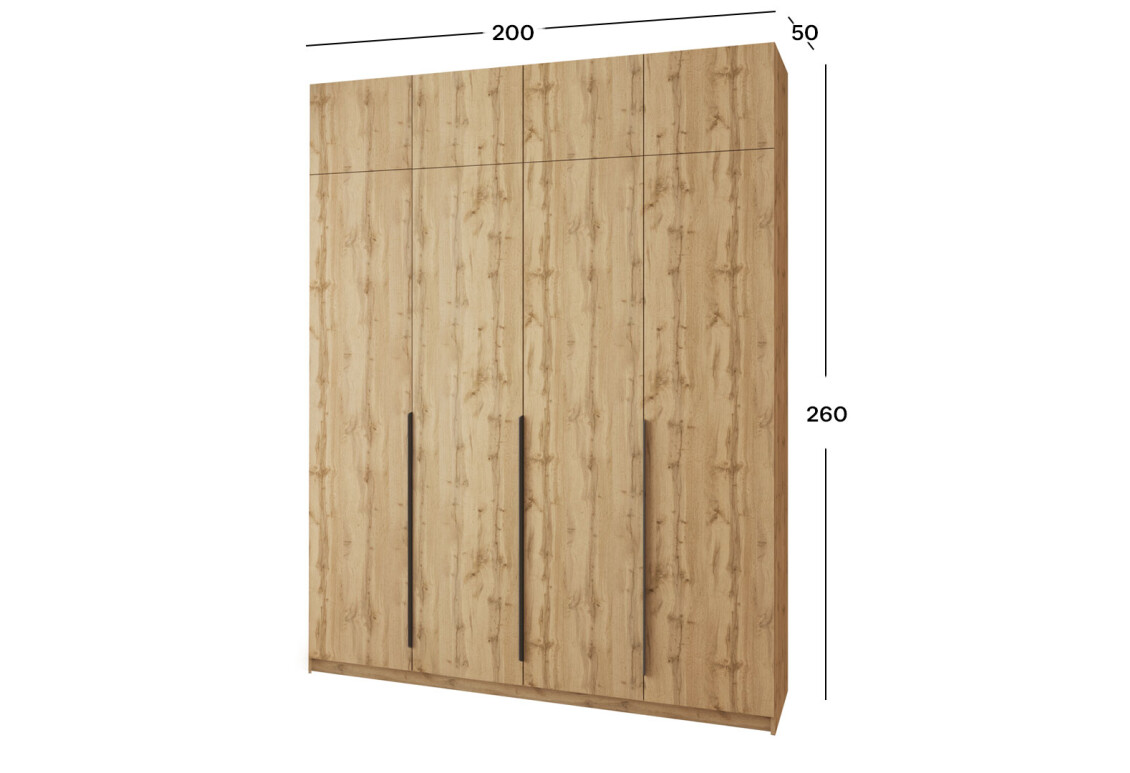 - Розмір: ширина 200 см, висота 260 см, глибина 50 см – ідеальні габарити для зберігання великої кількості речей.
