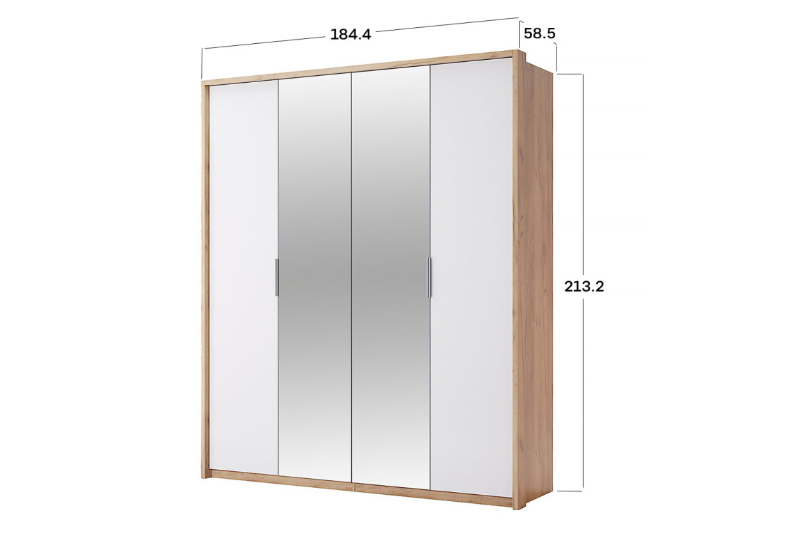 Шафа MiroMark Асті 4-дверна із дзеркалами – це ідеальне рішення для тих, хто цінує стиль та функціональність у своїх меблях. З розмірами 184 см завширшки, 213 см заввишки та 58 см завглибшки, ця шафа забезпечує достатньо місця для зберігання одягу, взуття та інших речей. Її сучасний дизайн у кольорах дуб крафт і білий додає елегантності будь-якому інтер'єру, а глянцева поверхня фасаду створює враження простору та світла. Завдяки металевим ручкам, відкривати дверцята буде зручно і легко. Модель виготовлена з якісної ламінованої ДСП, що гарантує надійність та довговічність використання. Ця шафа стане не лише практичним елементом вашого дому, а й стильним акцентом у вашій кімнаті.