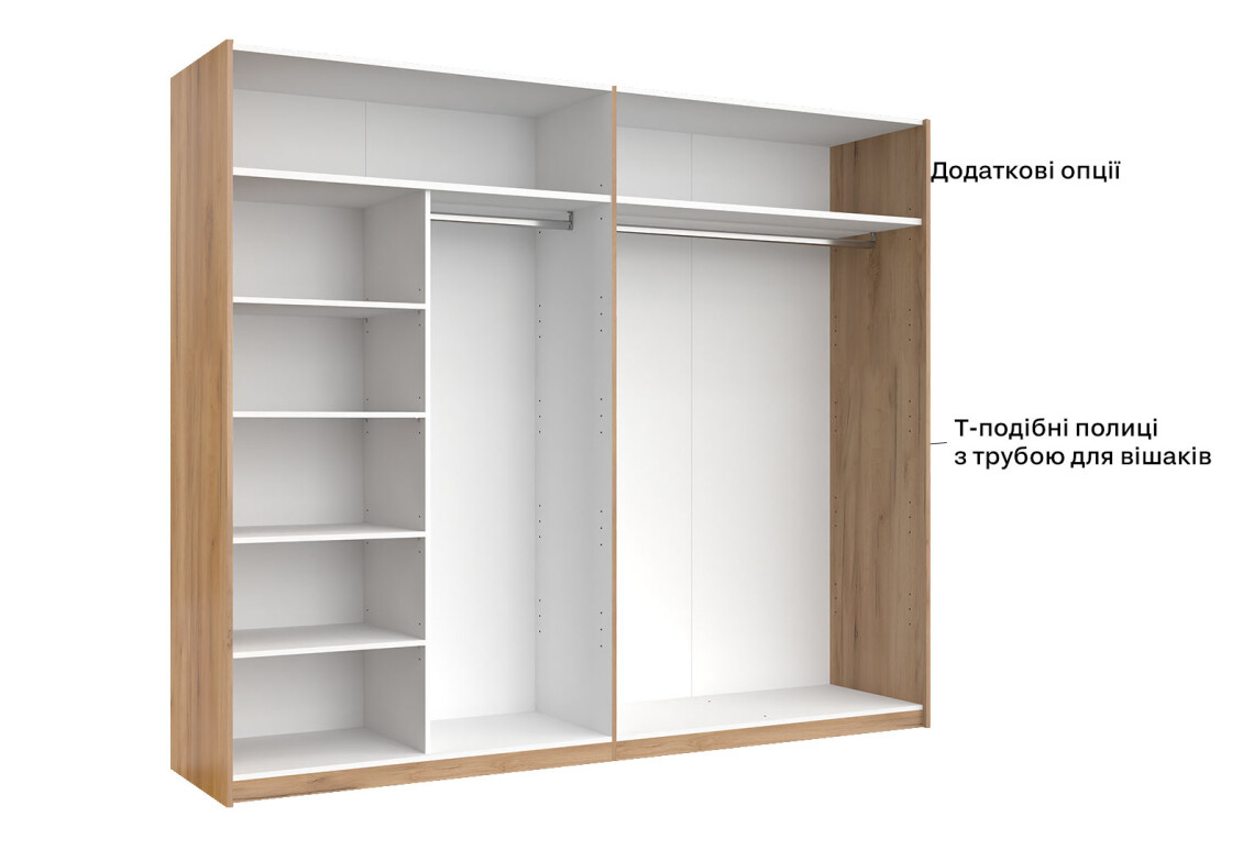 - Висота шафи-купе: 240 см, що дозволяє використовувати весь простір до стелі