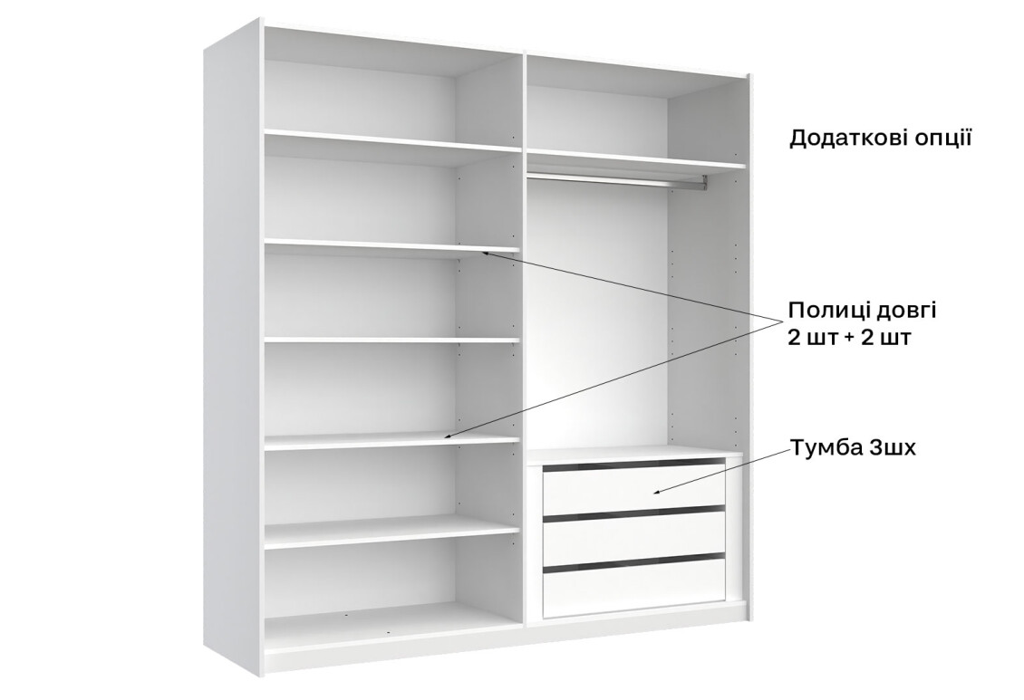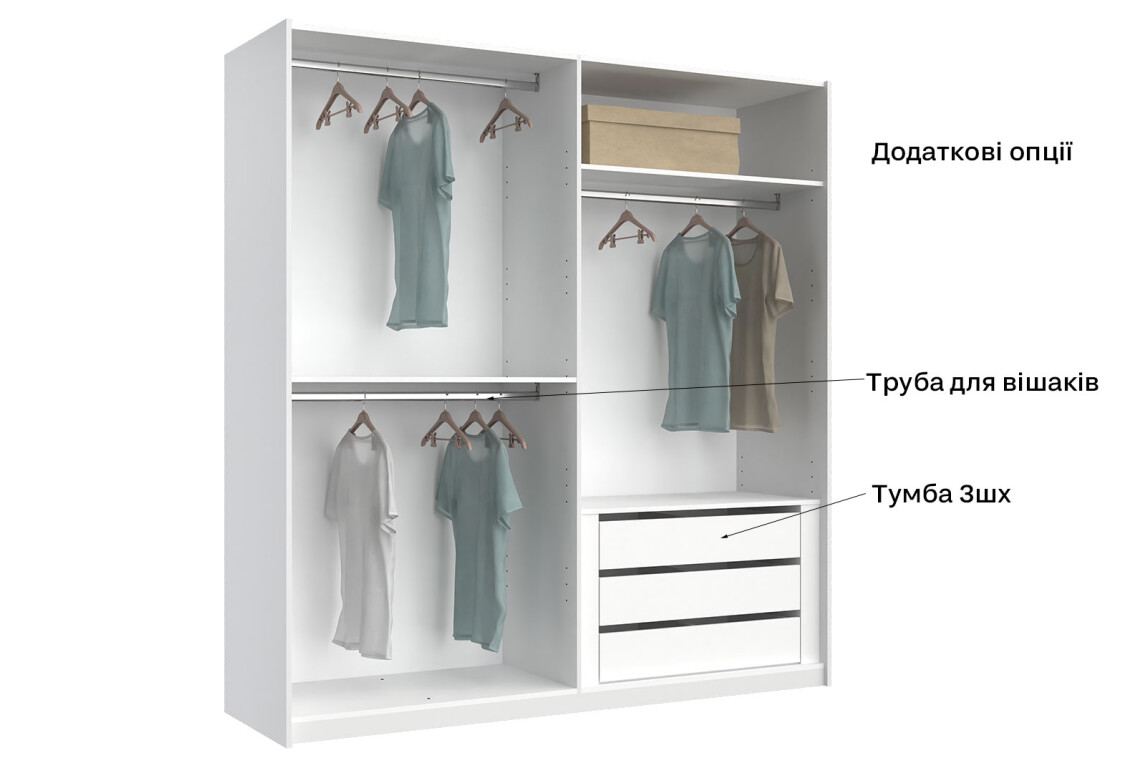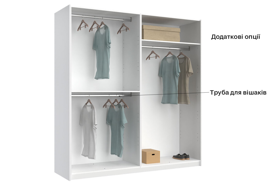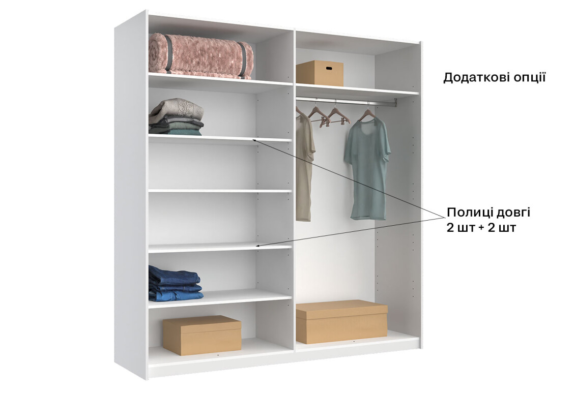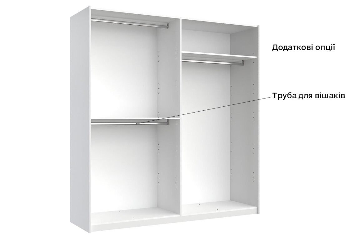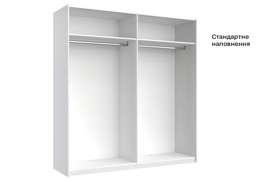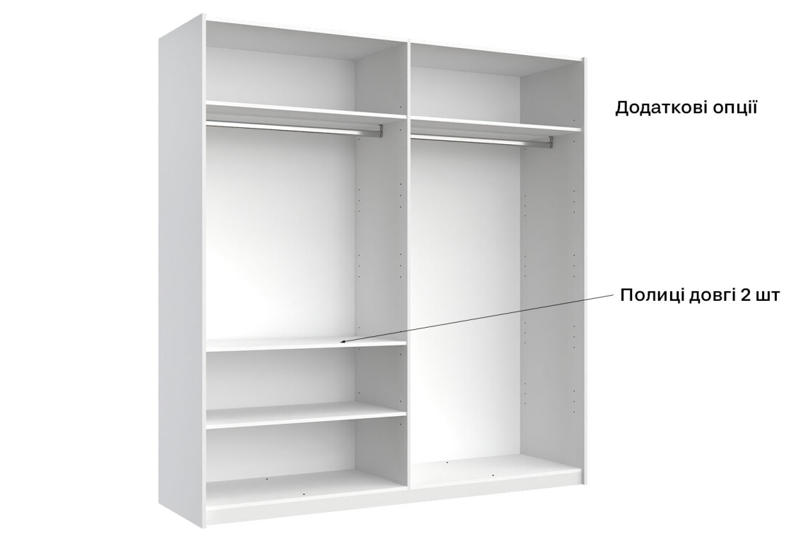 - Тип шафи-купе: 2D — зручність у використанні та доступ до всіх речей.