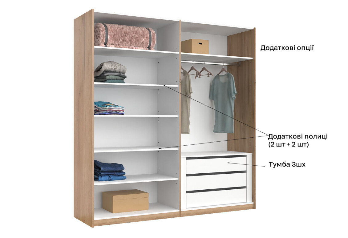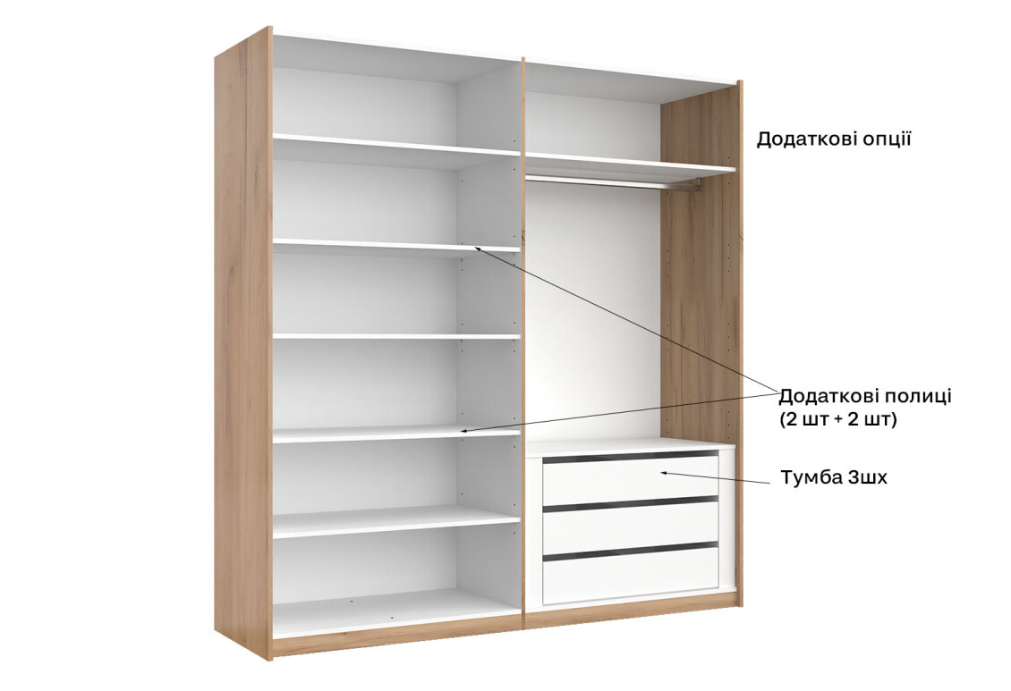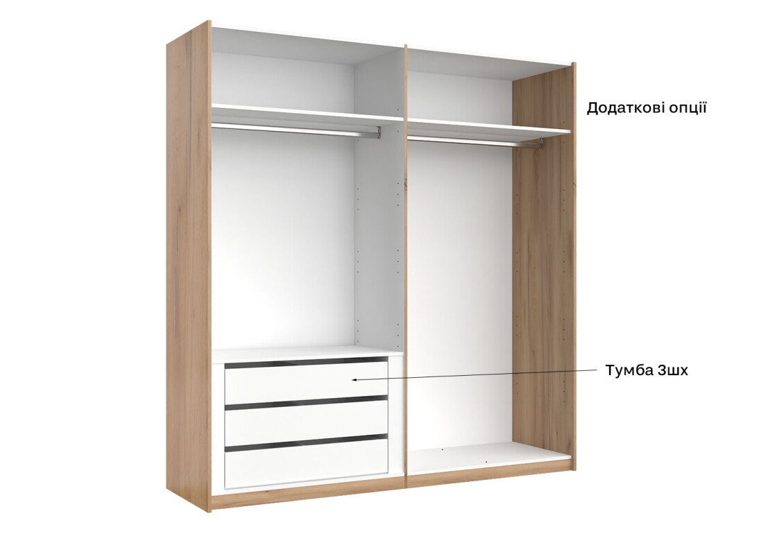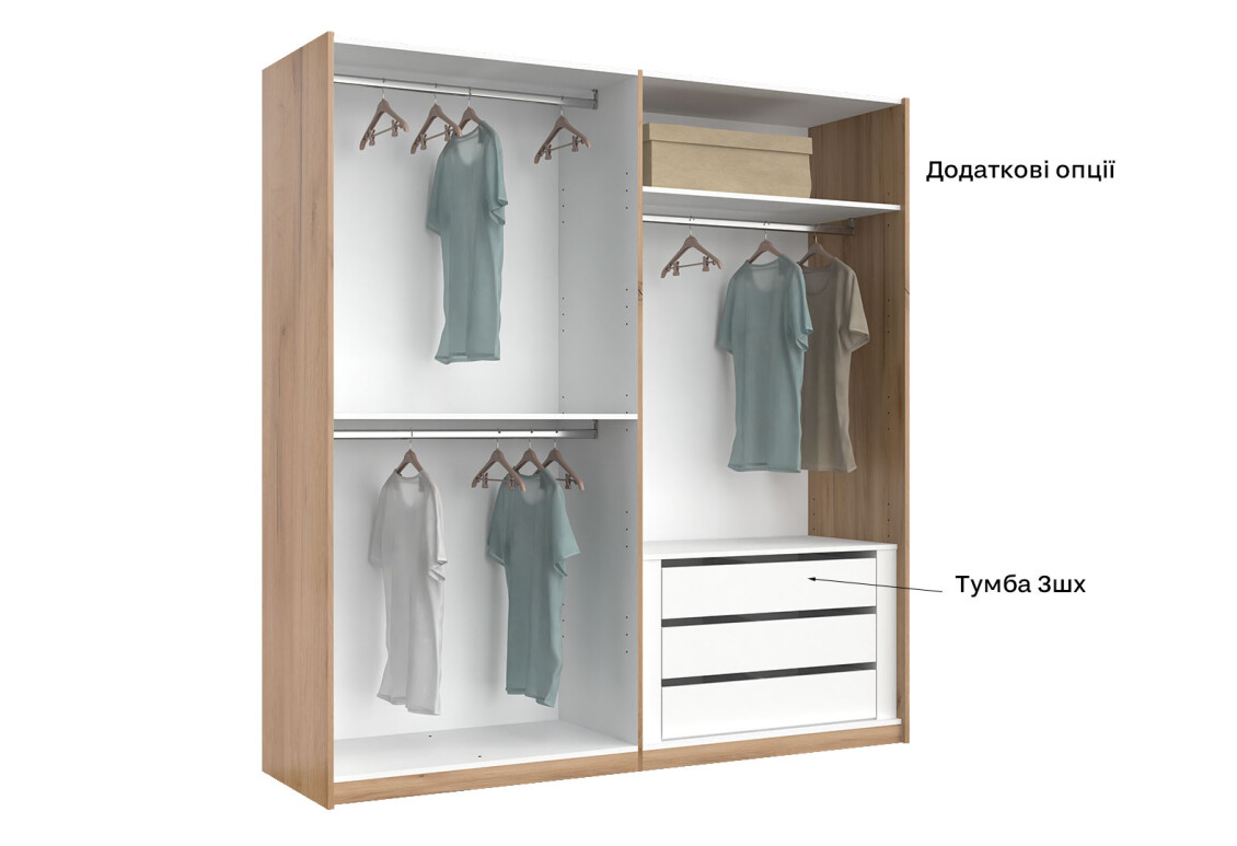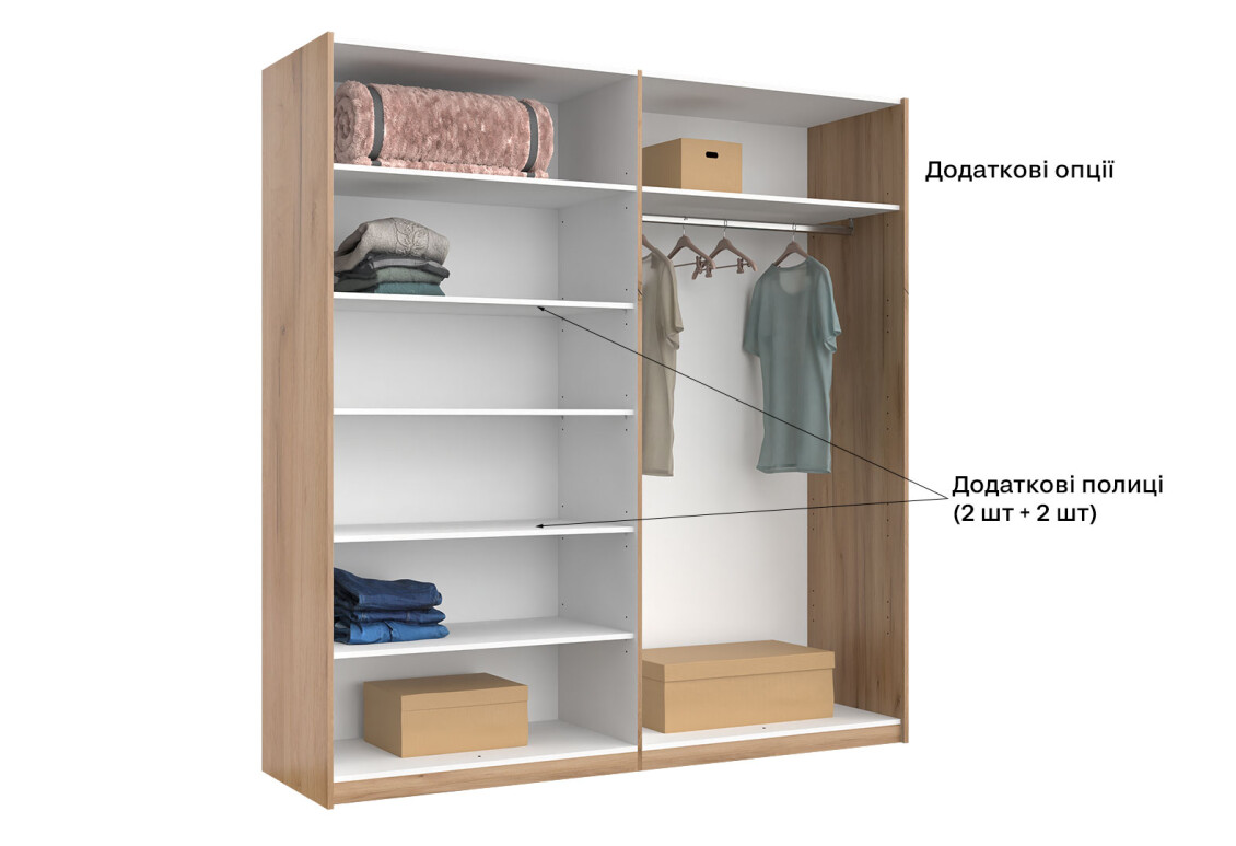 - Тип шафи-купе: 2D — зручна система розсувних дверей, що економить простір.