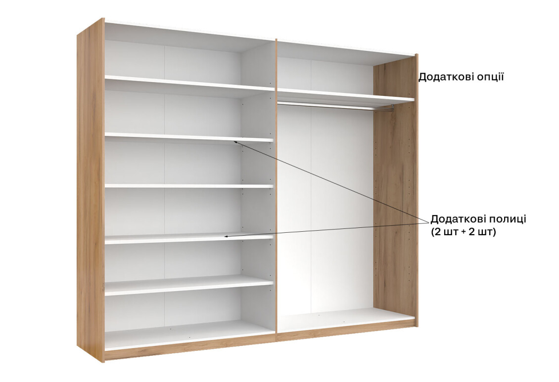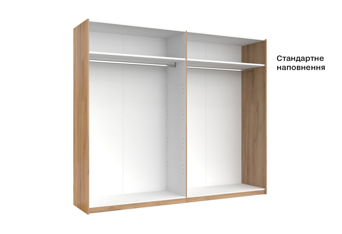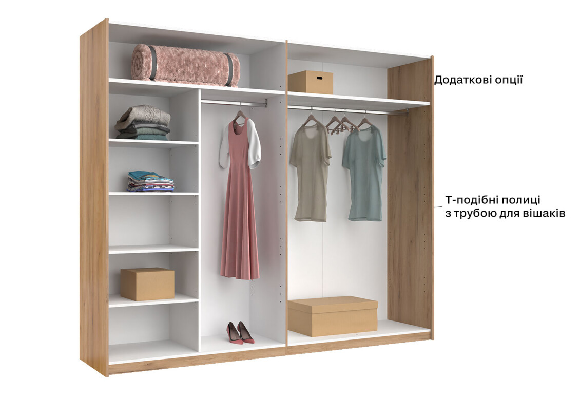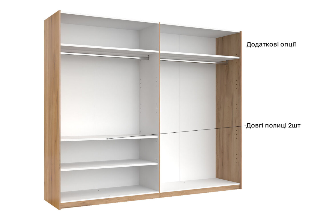 - Тип шафи-купе: 2D – зручний доступ до вмісту завдяки розсувним дверям.