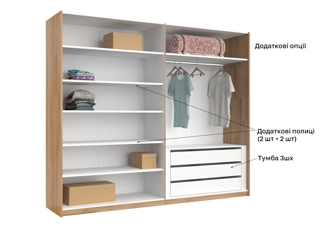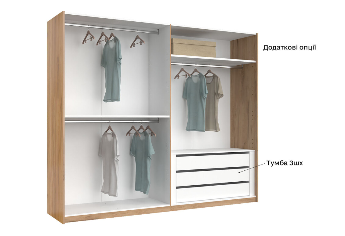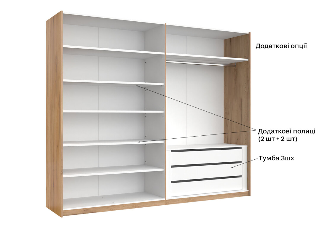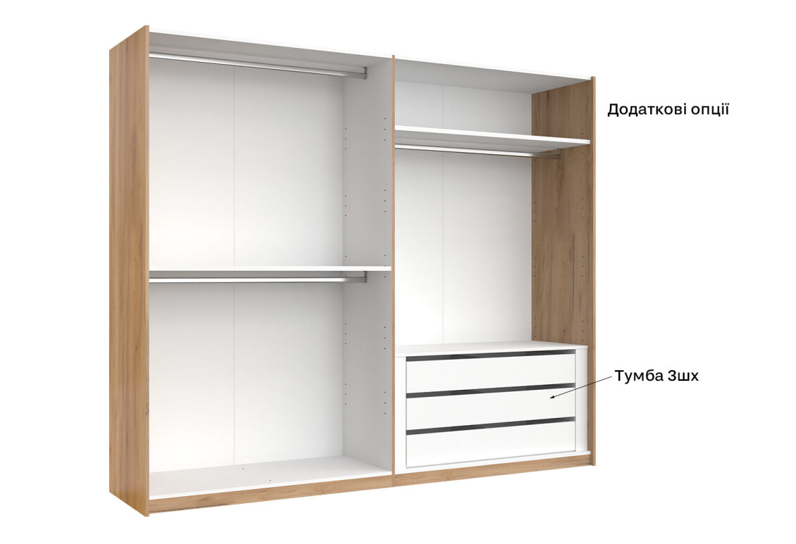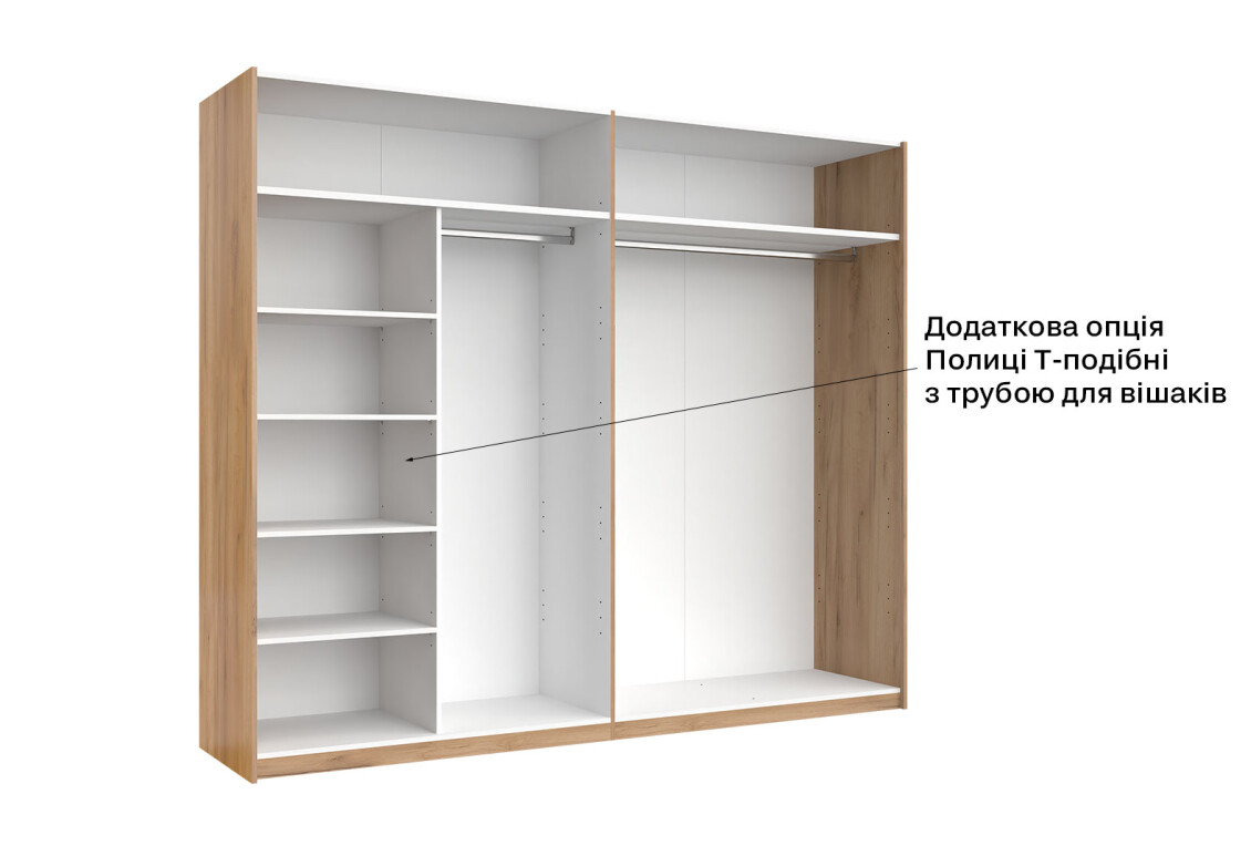 - Тип шафи-купе: 2D – зручний доступ до вмісту завдяки розсувним дверям.