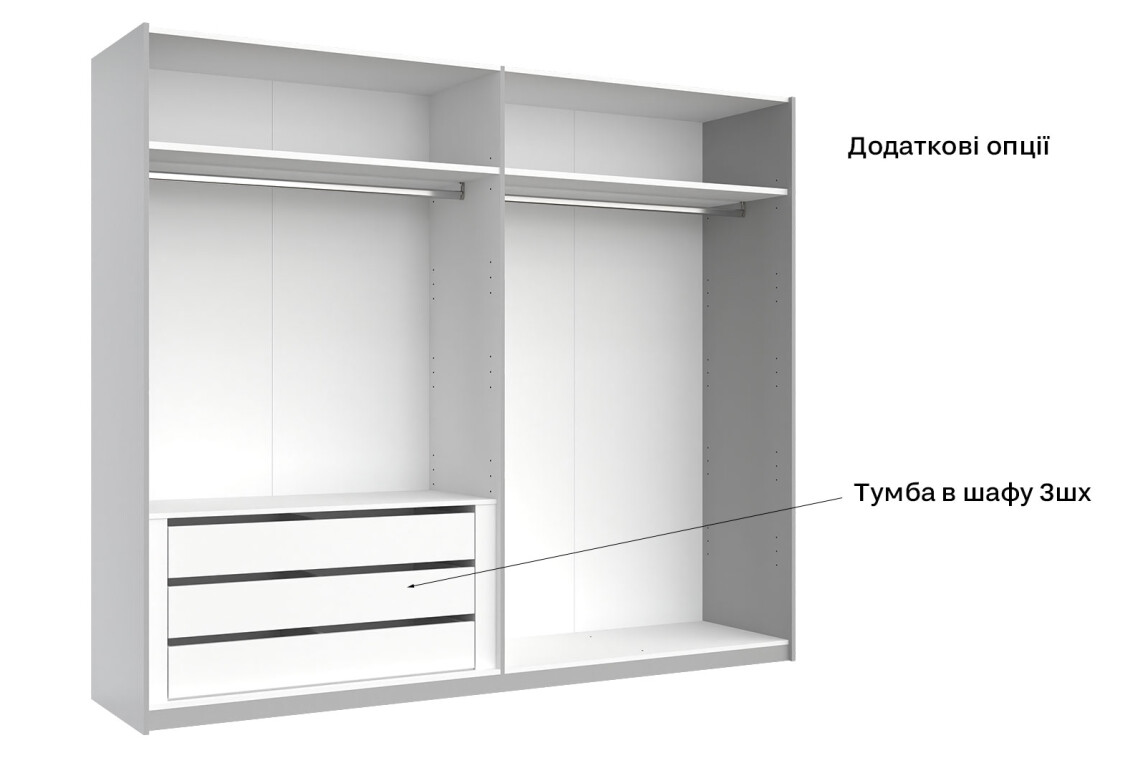 - Розмір: ширина 250 см, висота 210 см, глибина 61,5 см – оптимальні габарити для зберігання великої кількості речей.