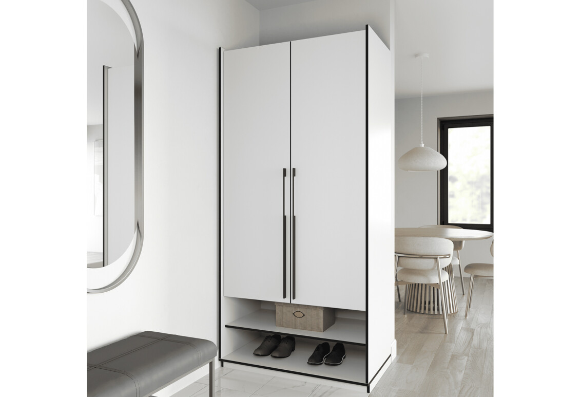 Шафа-пенал Moreli Ramo – це ідеальне рішення для організації простору вашого дому. Завдяки своїм компактним розмірам (ширина 100 см, висота 210 см, глибина 57 см) вона легко впишеться в будь-який інтер'єр, забезпечуючи при цьому достатньо місця для зберігання речей. Ця модель виконана в сучасному стилі з використанням ламінованої ДСП, що надає їй елегантного вигляду та довговічності. Білий колір шафи надає легкості і свіжості, а металеві ручки додають нотку сучасності. Шафа оснащена штангою та полицями, що дозволяє зручно організувати одяг та інші речі. Вигідно купити цю шафу саме у нас, адже ми пропонуємо конкурентоспроможні ціни, а також можливість придбати товар як оптом, так і в роздріб, з швидкою доставкою з наших складів.