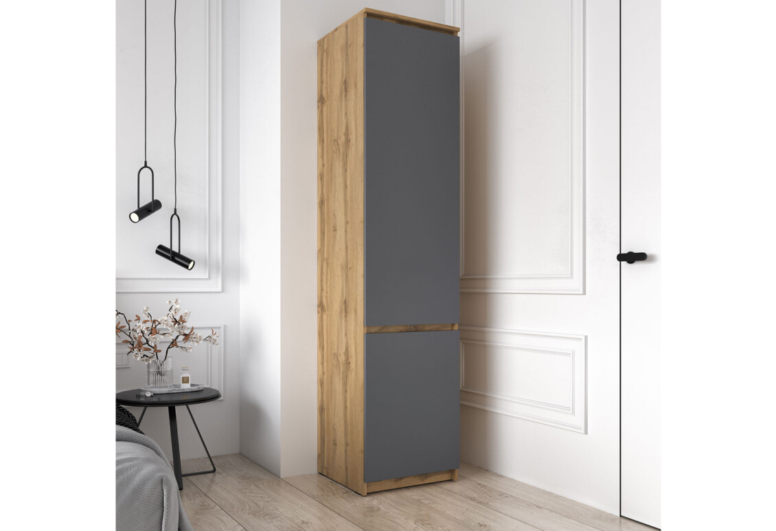 Шафа-пенал закритий Moreli T217 — це ідеальне рішення для тих, хто цінує функціональність та стиль у своїй оселі. Завдяки компактним розмірам (ширина 50 см, висота 211,7 см, глибина 49,8 см), цей пенал легко впишеться навіть у найменші приміщення, забезпечуючи при цьому достатньо місця для зберігання. Виготовлений з якісної ламінованої ДСП, він має стійкість до механічних пошкоджень та вологи, що робить його надійним вибором для щоденного використання. Стильний колір дуба аппалачі в поєднанні з антрацитом надає виробу сучасного вигляду, що підходить до будь-якого інтер'єру. Важливою перевагою є відсутність ручок, що додає елегантності та робить користування ще зручнішим. Шафа-пенал доступна в різних модифікаціях кольору, що дозволяє підібрати ідеальний варіант для вашого дому.