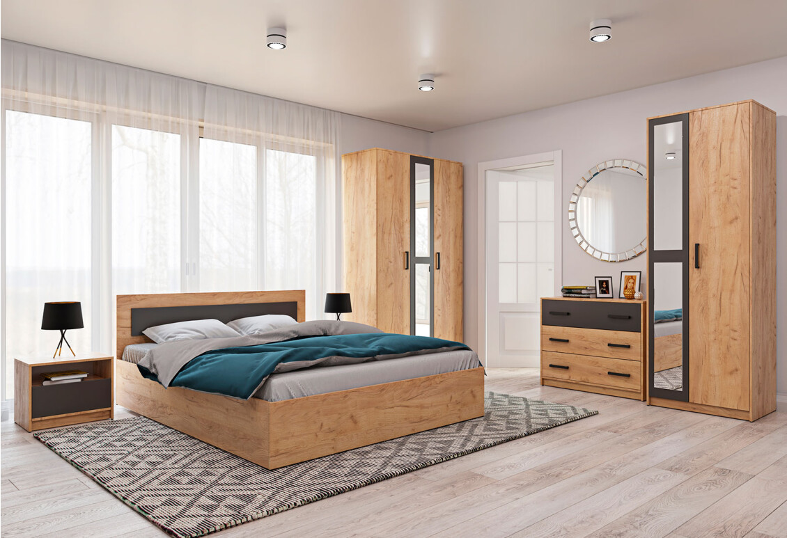 Спальня Віва / Viva 2+3D в кольорі дуб крафт золотий та антрацит – це ідеальний вибір для тих, хто цінує сучасний стиль та функціональність. Цей комплект меблів включає в себе все необхідне для створення комфортного простору для відпочинку. Виготовлений з якісної ламінованої ДСП, він забезпечує надійність та довговічність використання. Спальня Віва включає тридверну, п'ятидверну та дводверну шафи, що дозволяє оптимально організувати простір. У комплект також входить зручне двоспальне ліжко, що забезпечить комфортний сон, а також приліжкові тумби та комод, які нададуть додатковий простір для зберігання.